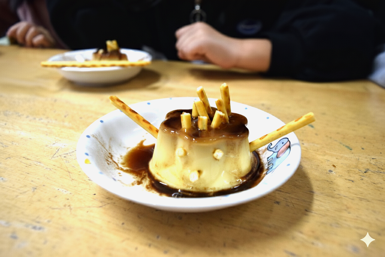 プリッツを刺したプリンが、なんだか楽しそうに揺れています。