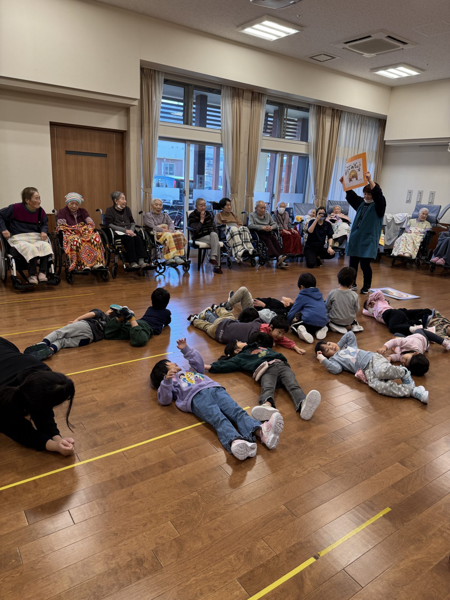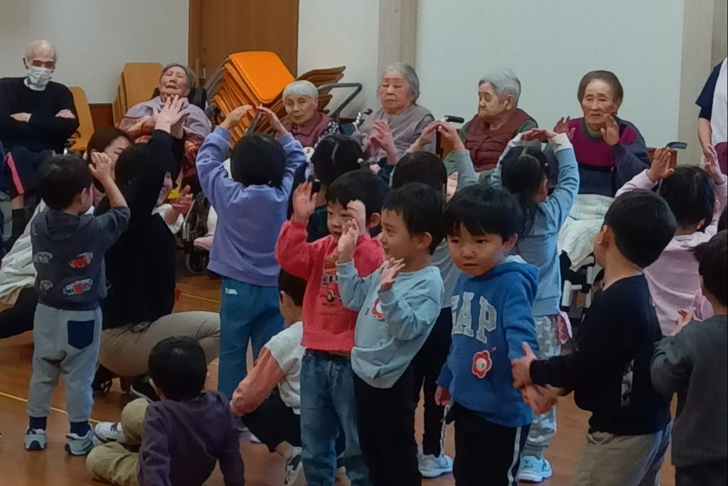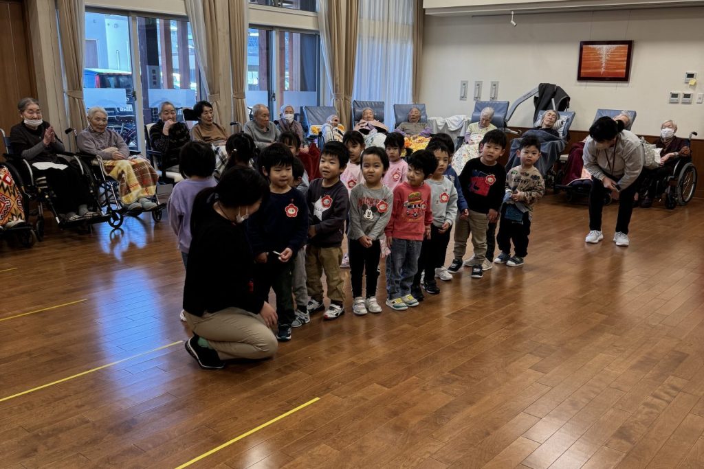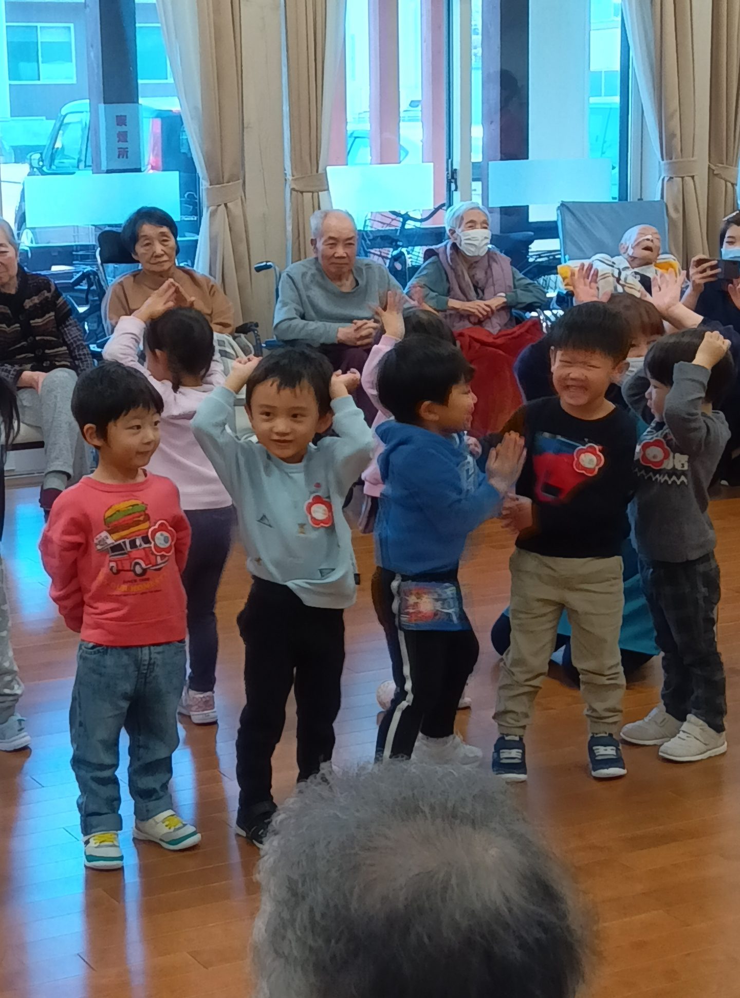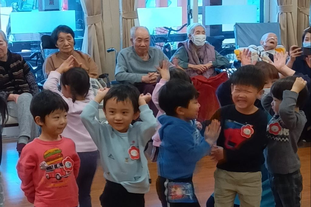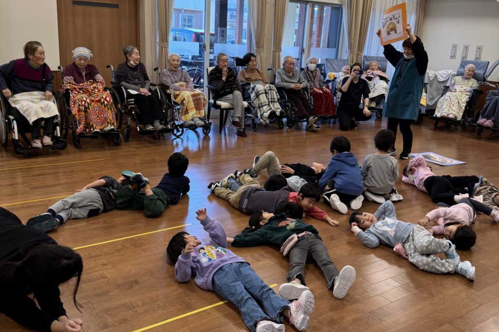 跳ねたり寝転んだり、みんなげんきいっぱいですね。入居者さまたちも子ども達から元気をいっぱいもらいました。