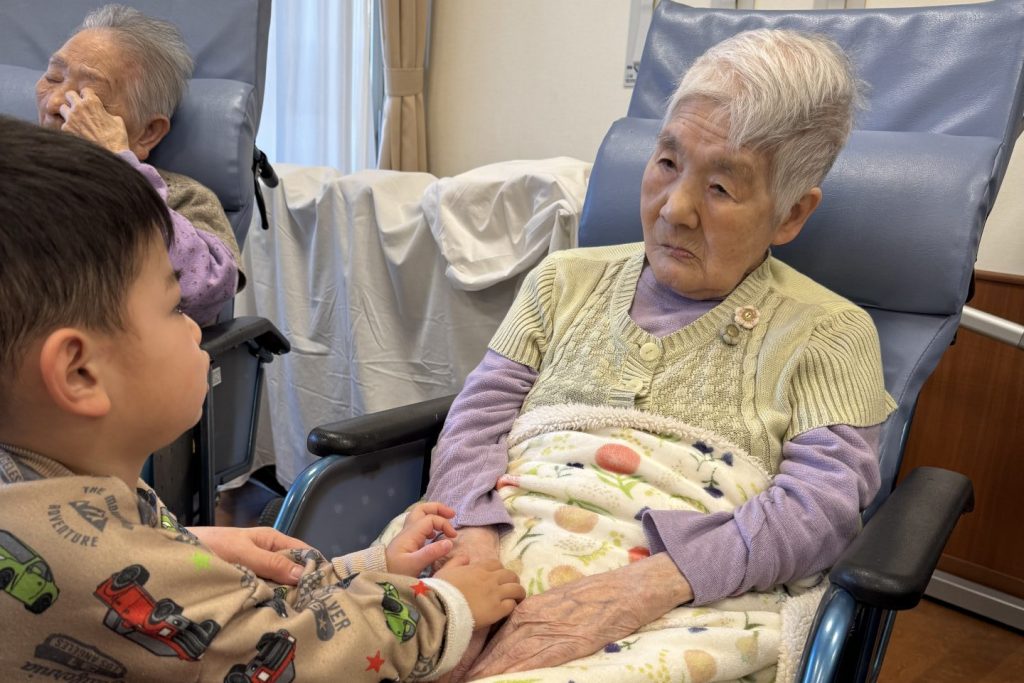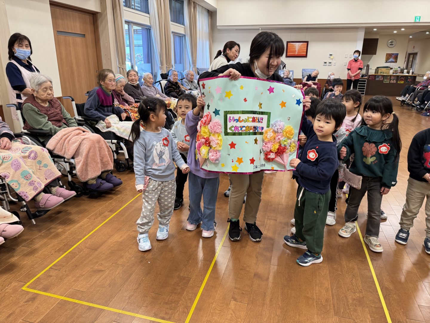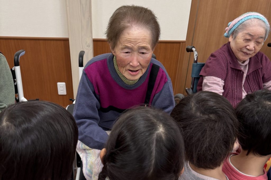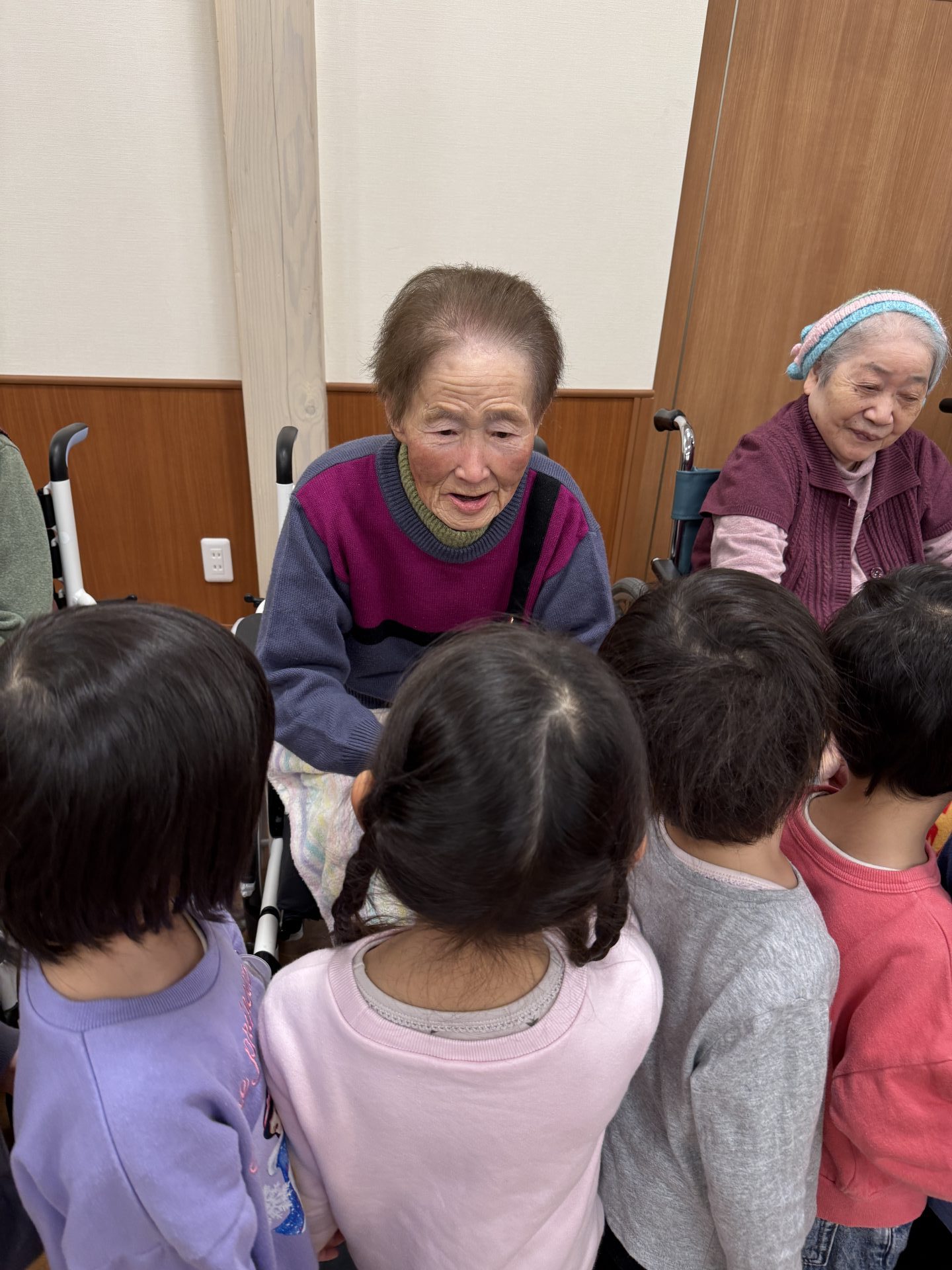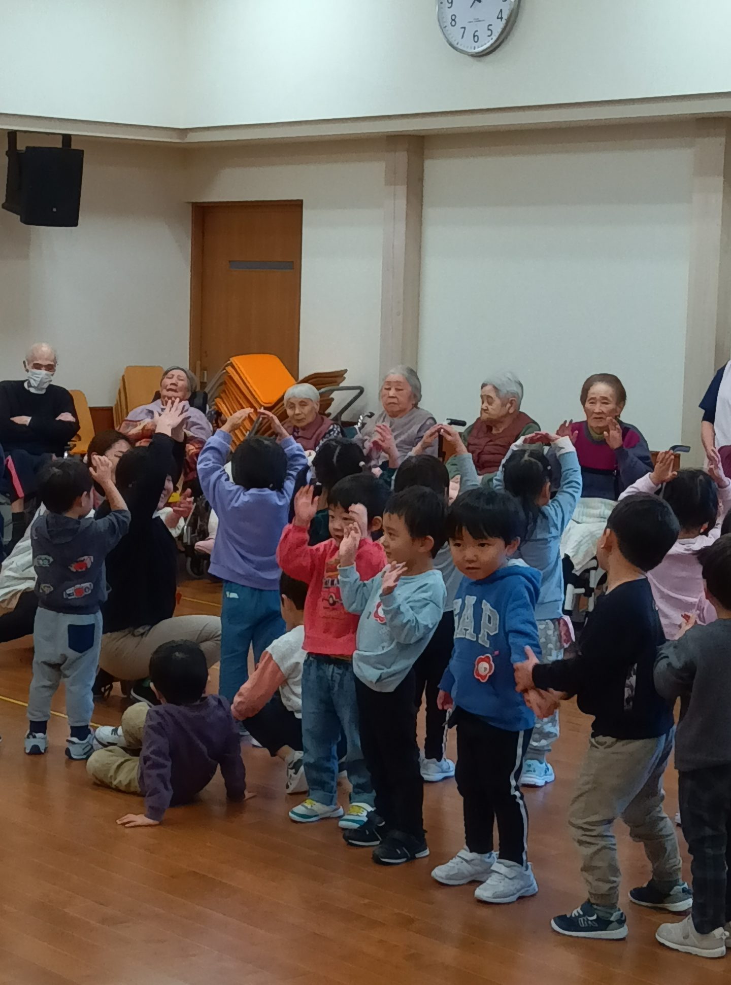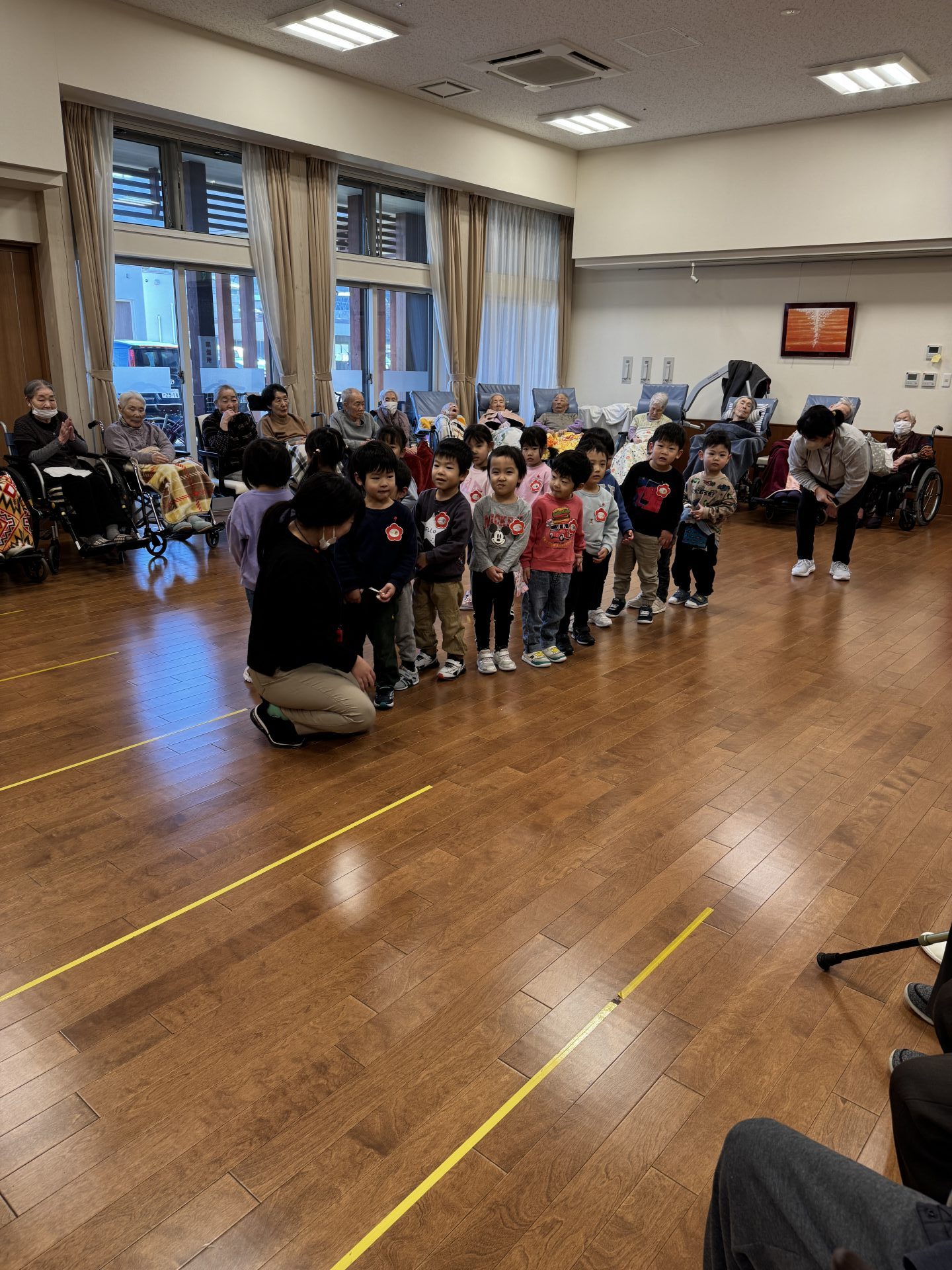 跳ねたり寝転んだり、みんなげんきいっぱいですね。入居者さまたちも子ども達から元気をいっぱいもらいました。