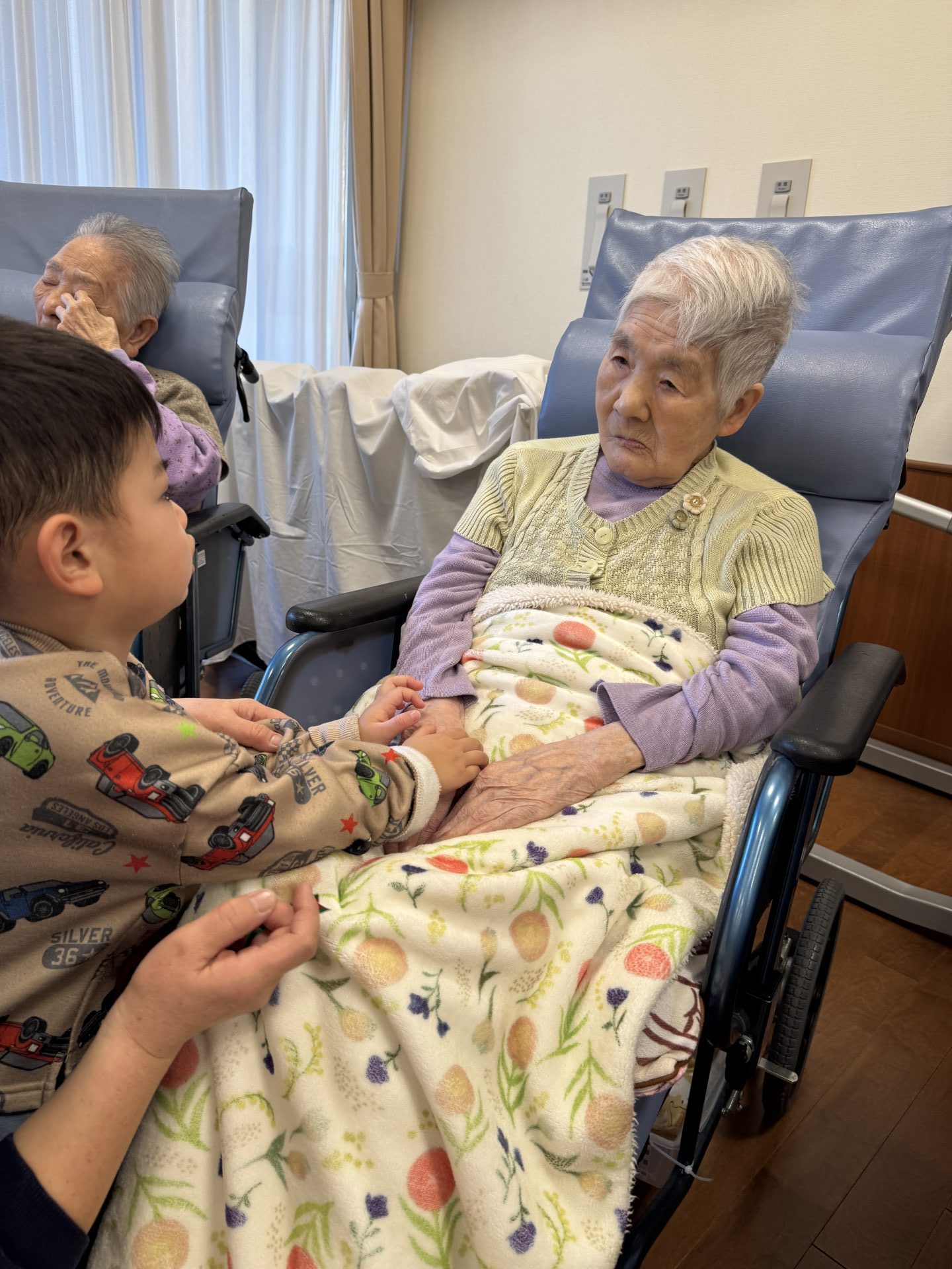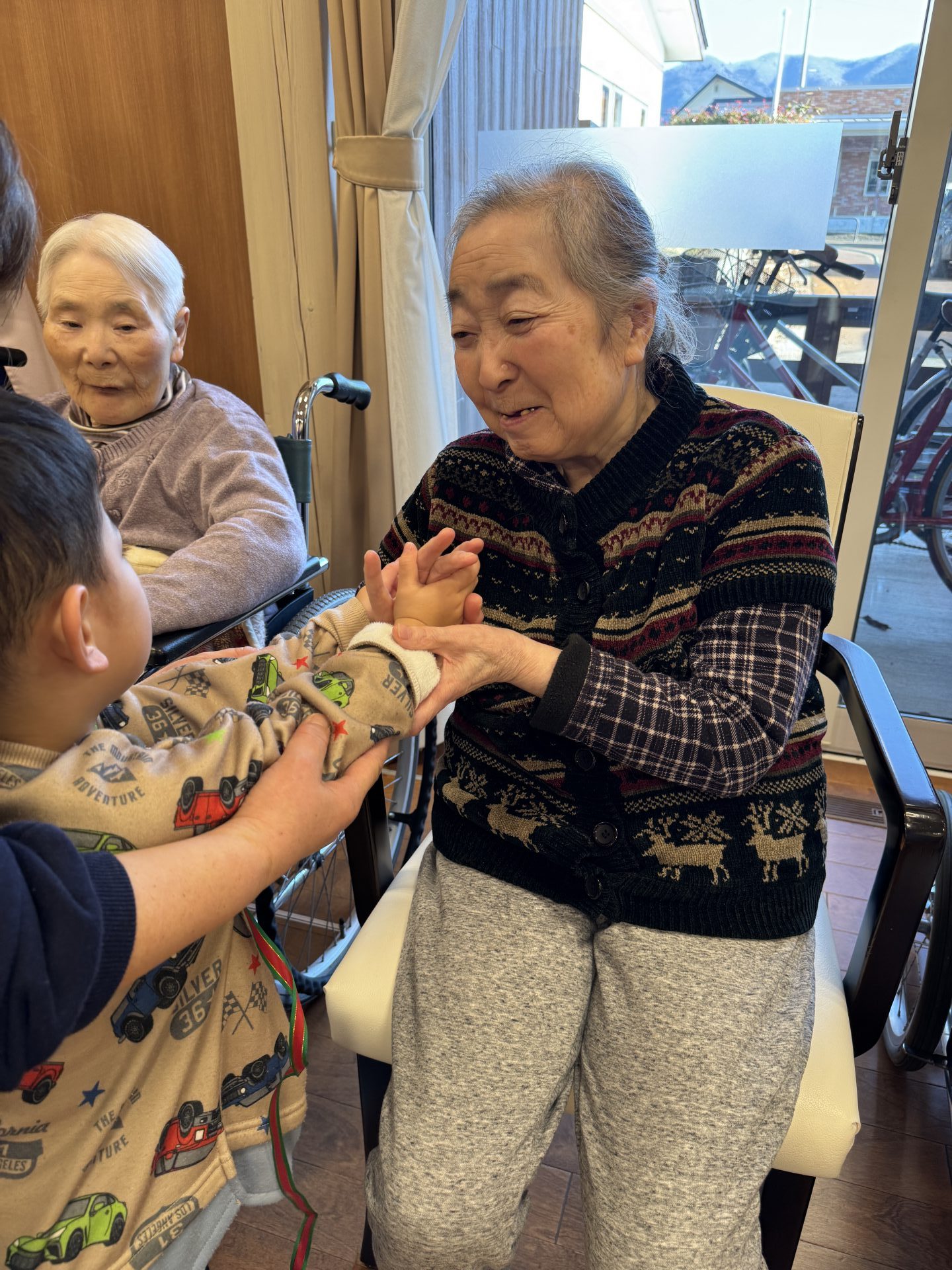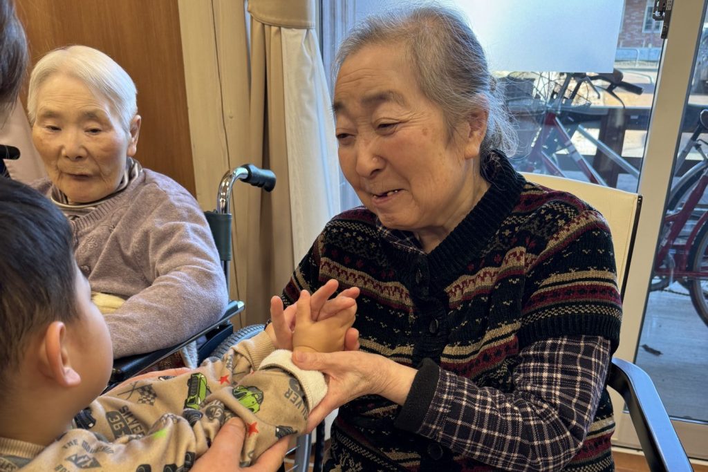 さようならのふれあいタイムは入居者さまたちも張り切って手を伸ばして握手をしていました。これでまた元気を分けてもらいましたね。