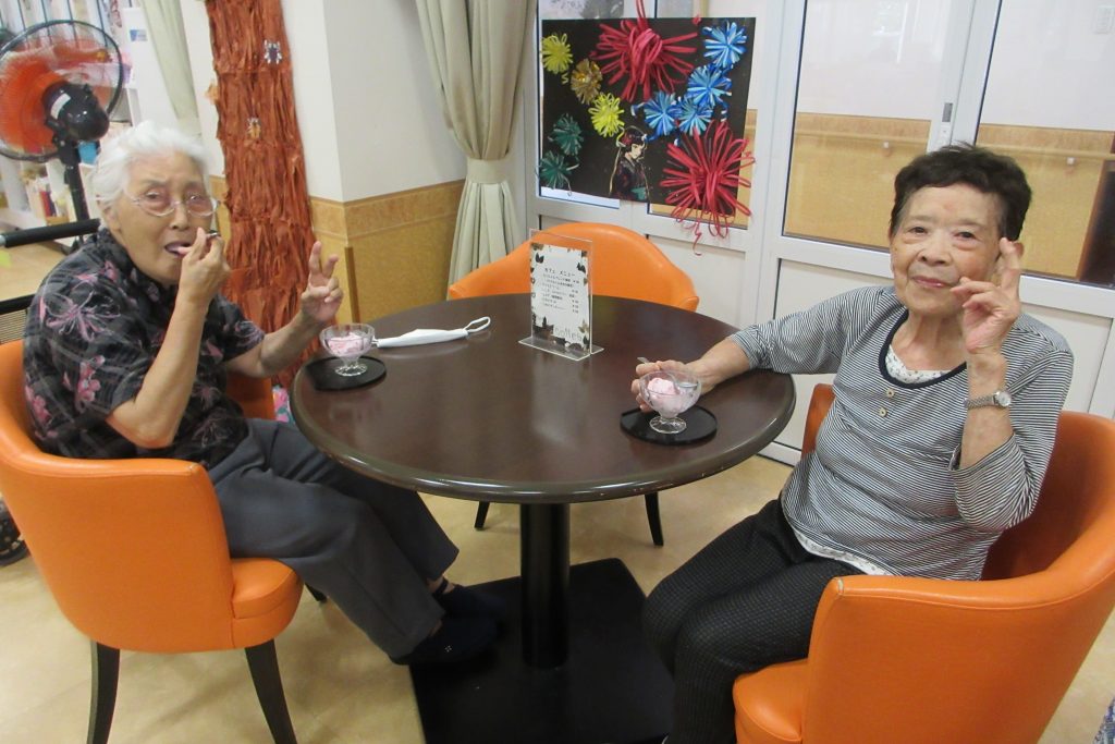 デイサービスセンターでは入浴後の人気コーナーとなり、「お風呂上がりの一杯」を楽しみにされている利用者さまで賑わっています。期間限定で販売しているかき氷や、様々なフレーバーを楽しめるアイスクリームが特に人気です。