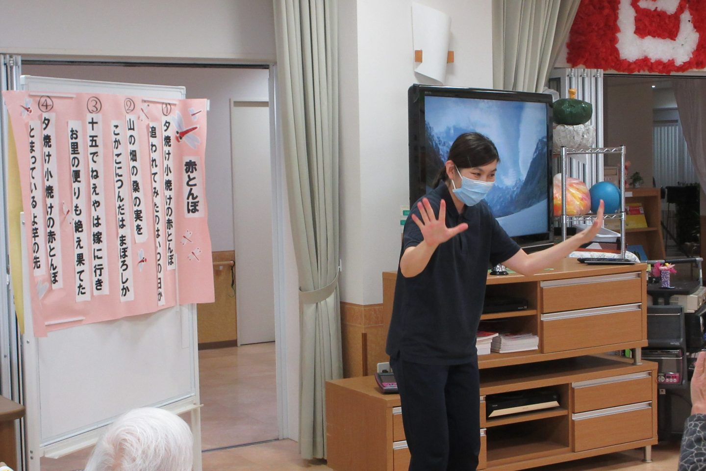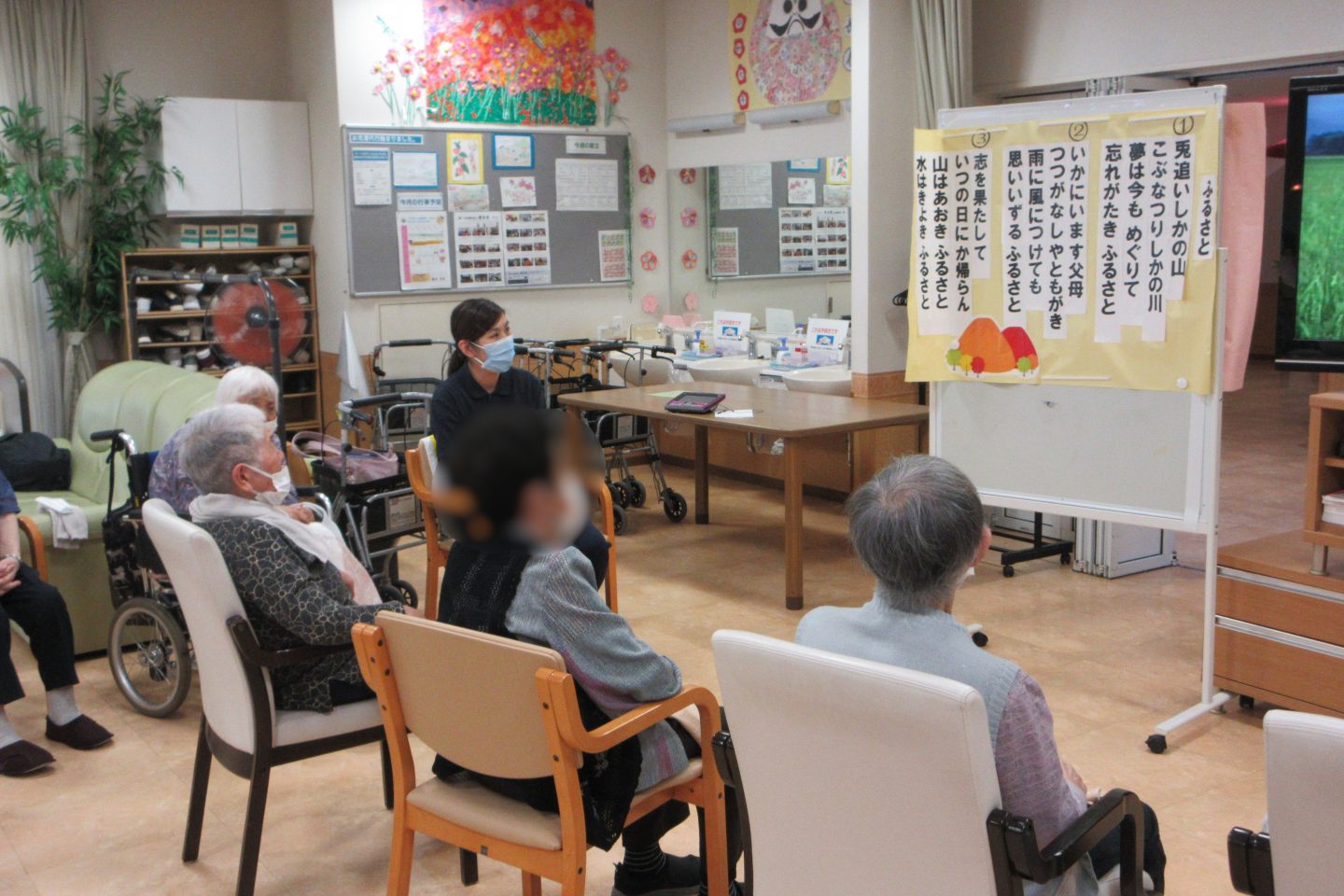 準備運動を兼ねて、お口の体操から。「ふるさと」と「赤とんぼ」の曲を皆さまと歌いました。