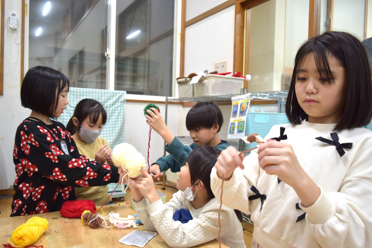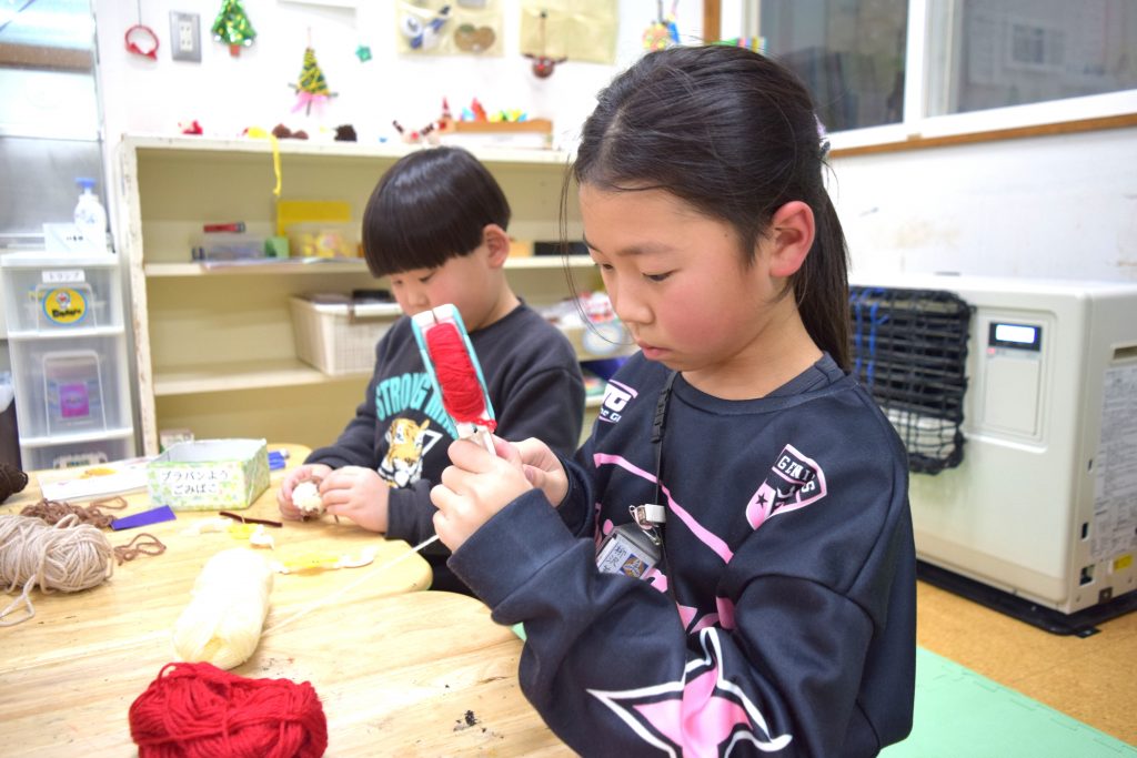 毛糸を専用の器具にくるくるくるくると丁寧に巻いていきます。ふわふわで可愛いポンポン作りにみんな夢中です!