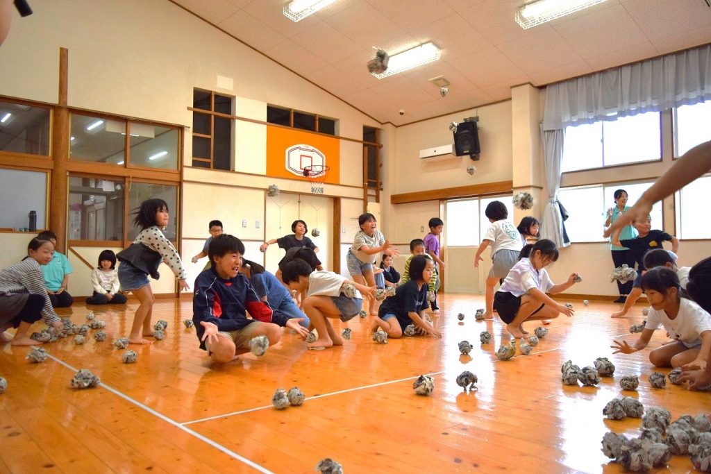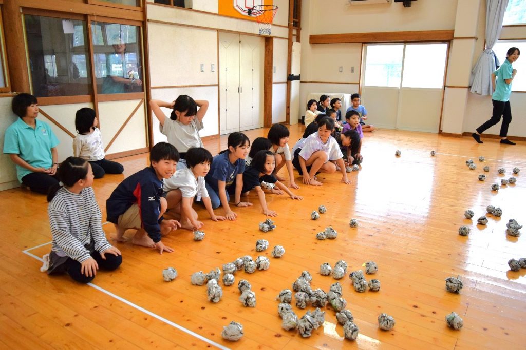 ルールはシンプル。新聞紙の玉を相手のコートに投げ入れ、最後に自分のコートに残った玉が少ない方の勝利です。