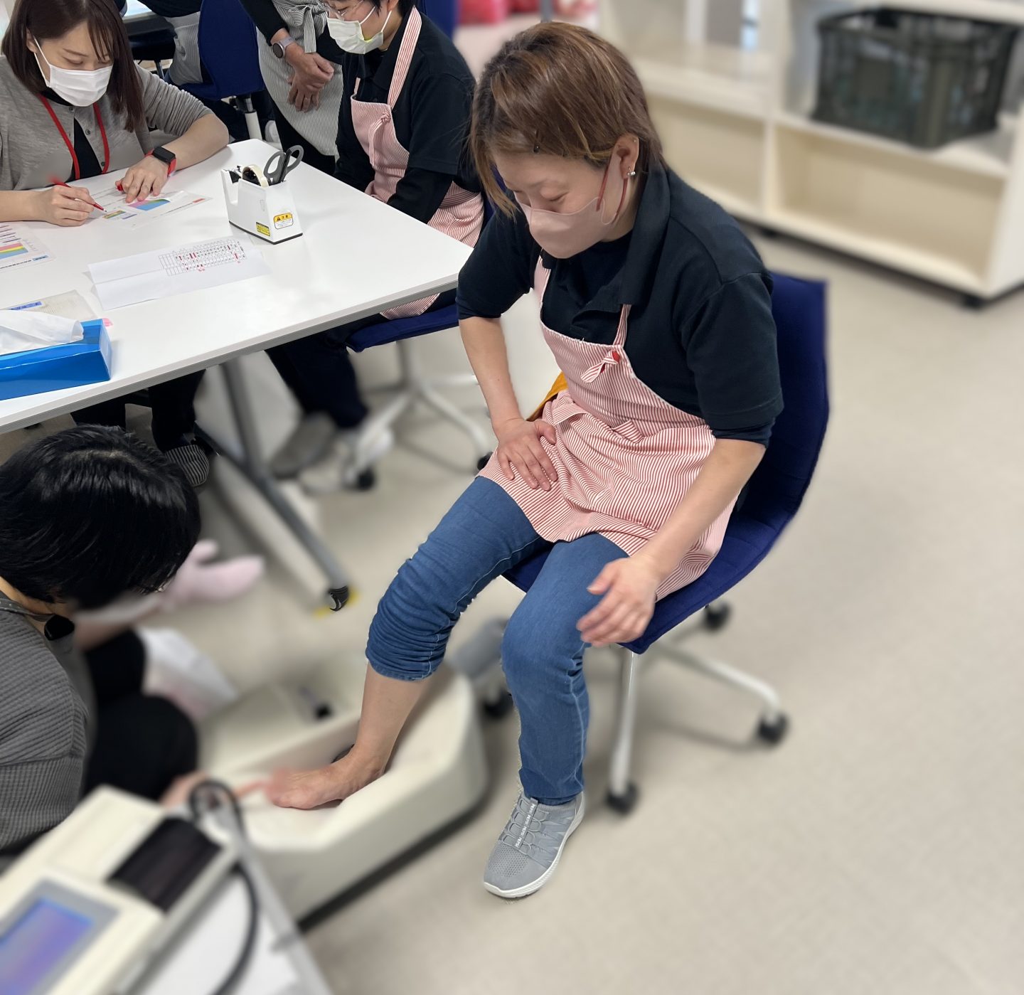 3月は、市役所から保健師の方をお招きし、出前講座を開催しました。まずは、骨密度測定器を使って、骨密度を測定しました。初めて測定する方も多く、「どんな数値が出るのかな?」「骨が弱くなっていたらどうしよう・・・」と、みなさん少しドキドキしている様子でした。測定後は自分の数値と平均値を見比べながら、真剣に結果を確認されていました。