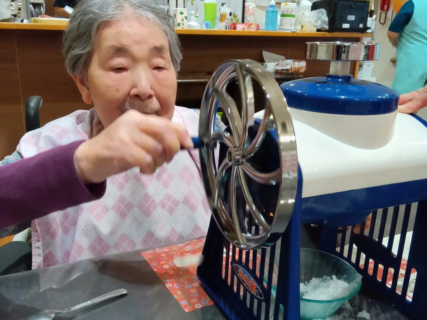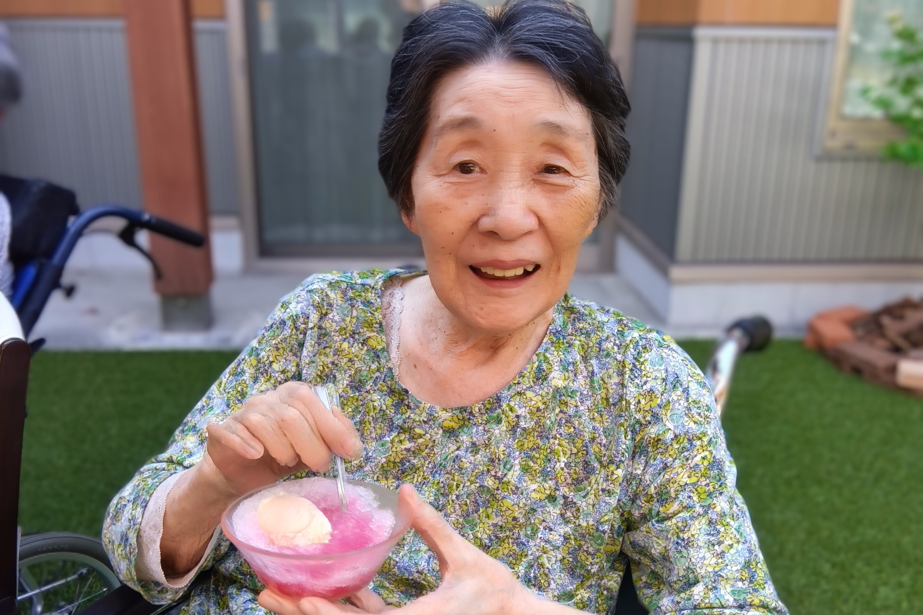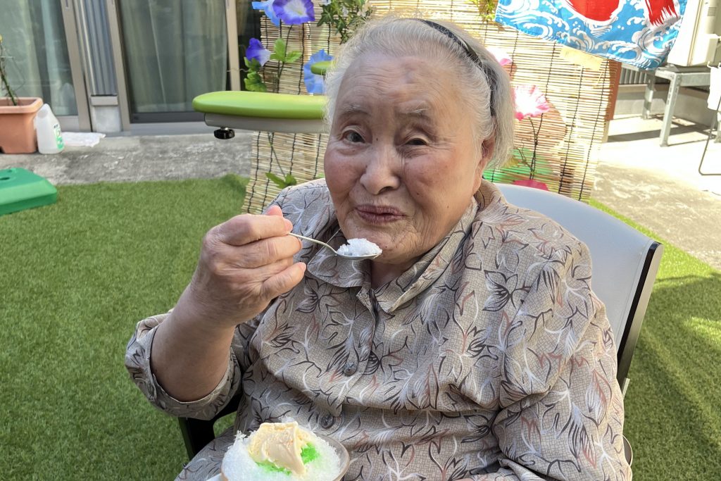 夏本番の暑さが続く中、入居者の皆さまと一緒に特製かき氷を楽しみました。