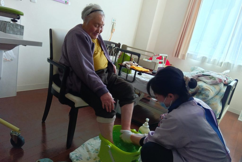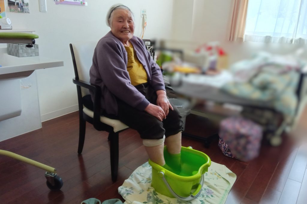 お湯を入れ替え、数十分温めただけでも血行が促され、足先も赤みを帯びていました。入居者さまから「いや~ありがでがった。どもども。」と笑顔が見られていました。