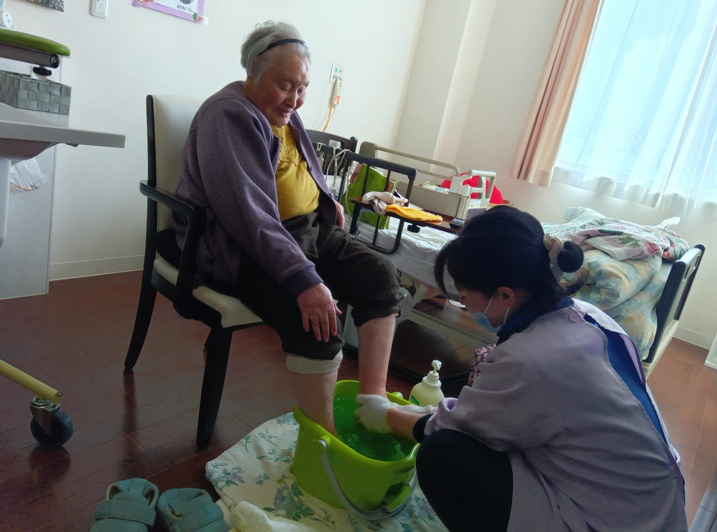 寒さの厳しいこの日、入居者さまから「足しゃっこくてどもなねたいに、足湯やってけねべが?」との申し出があり、暖かい居室で足湯を行うことに。