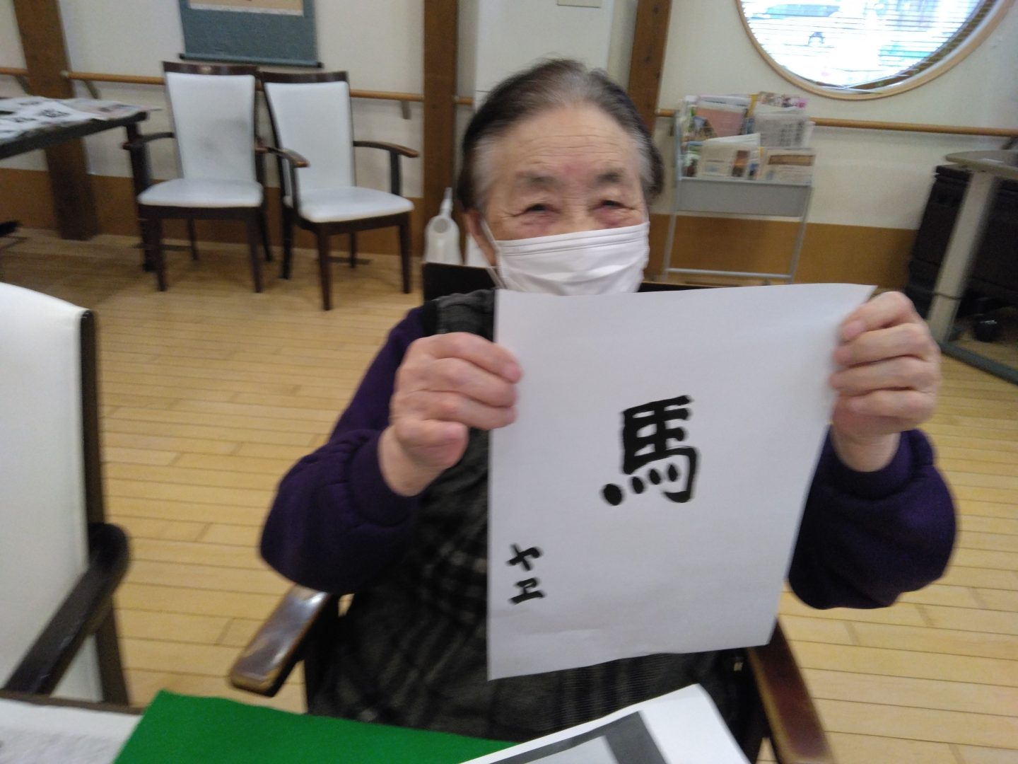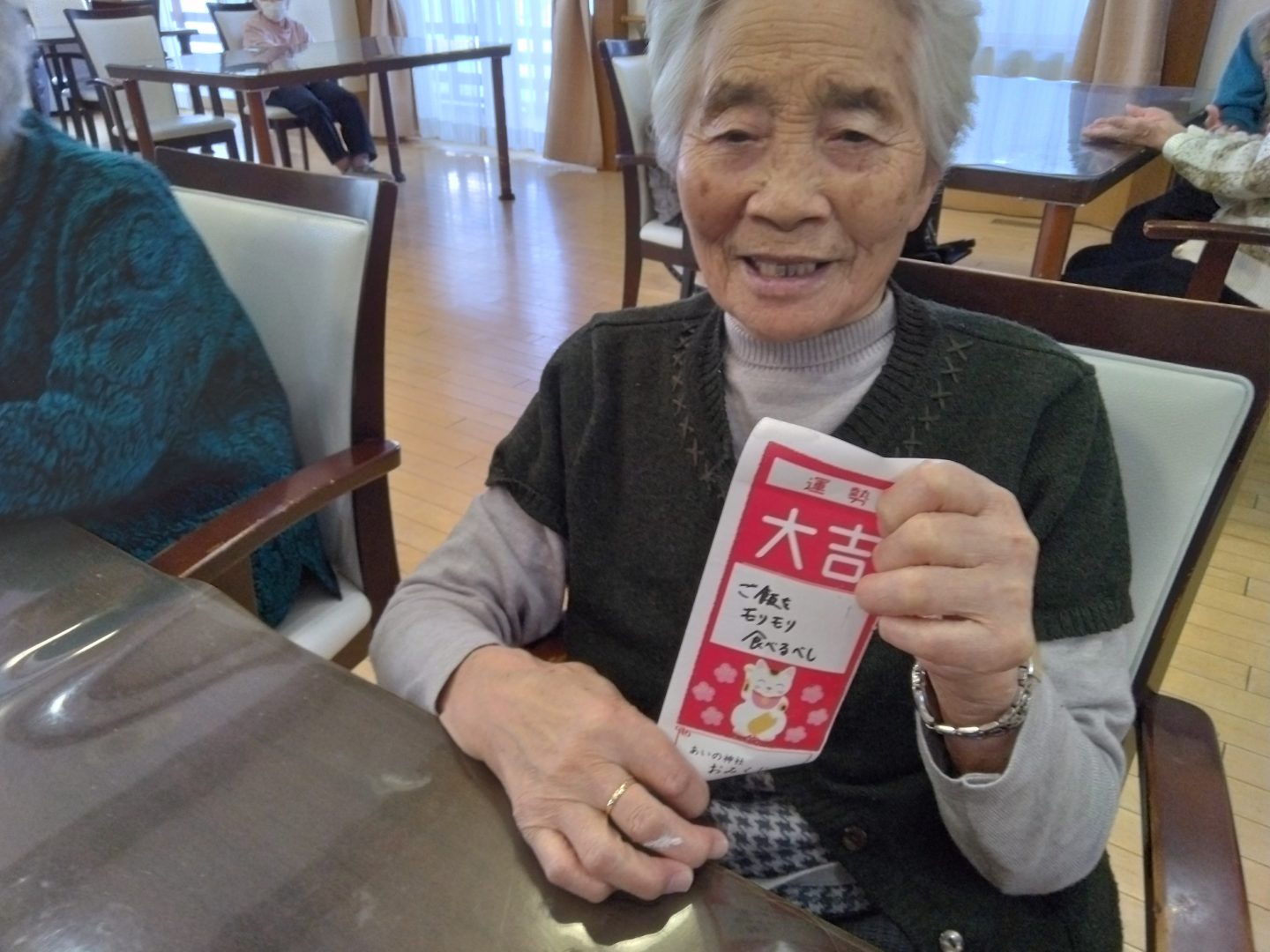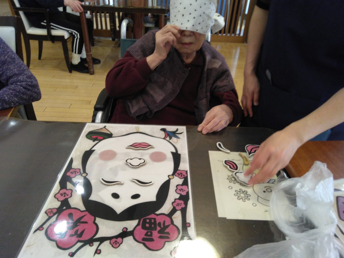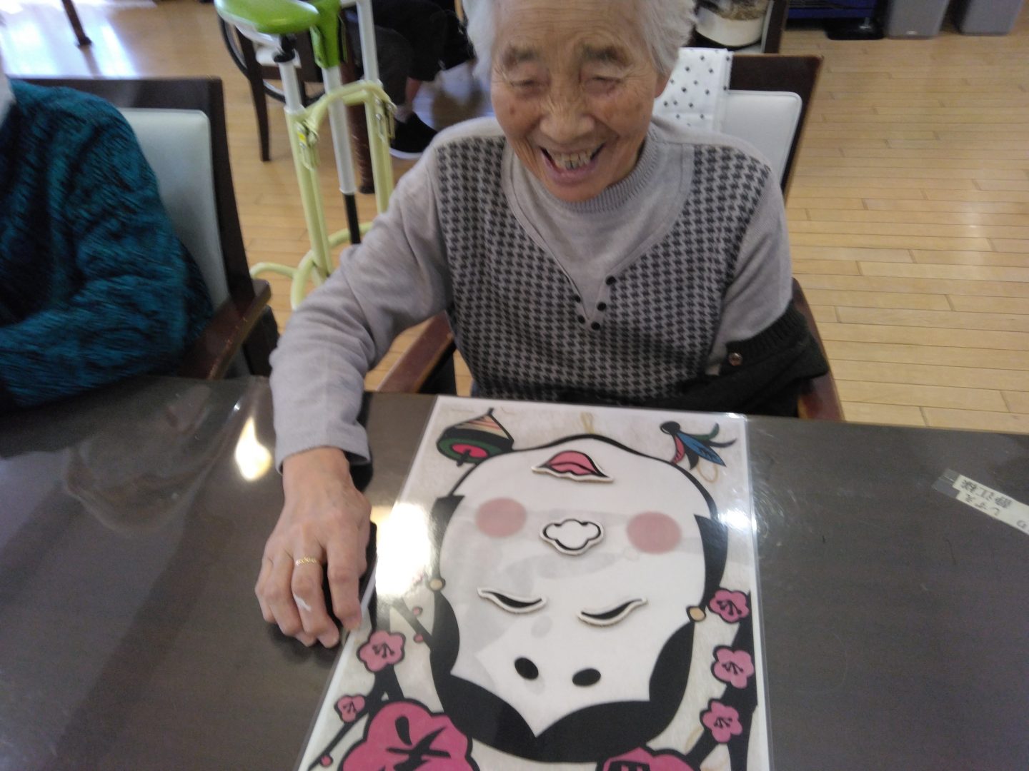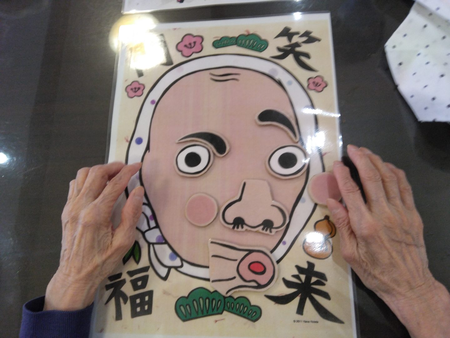 お正月ということで、皆さんで福笑いを楽しみました♪ 出来上がった顔を見て「あらら、いい顔だなぁ」と大笑い! 皆さんそれぞれ、個性あふれる「良い顔」を完成させていらっしゃいました。