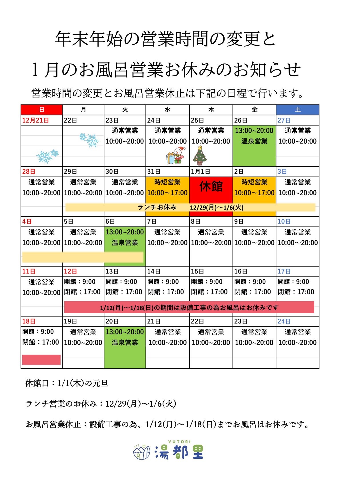 年末年始営業時間変更のお知らせと1月営業のお知らせについて