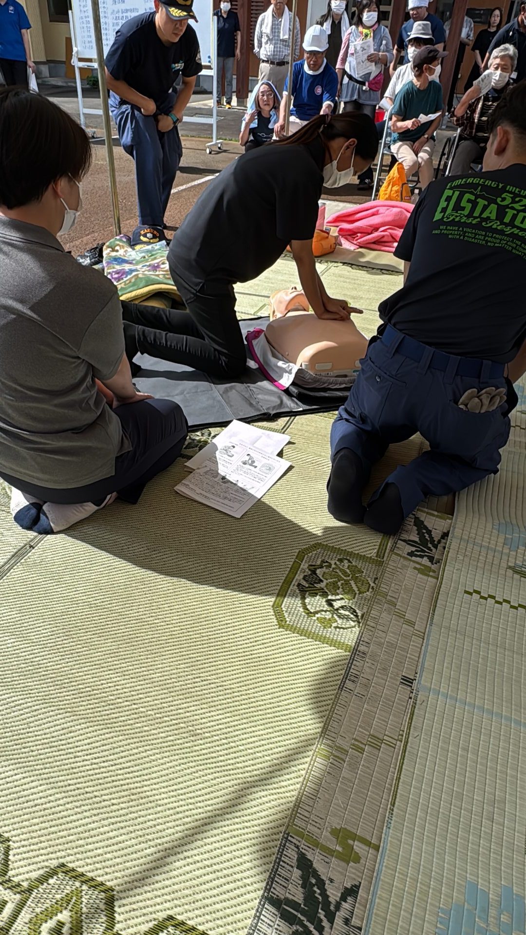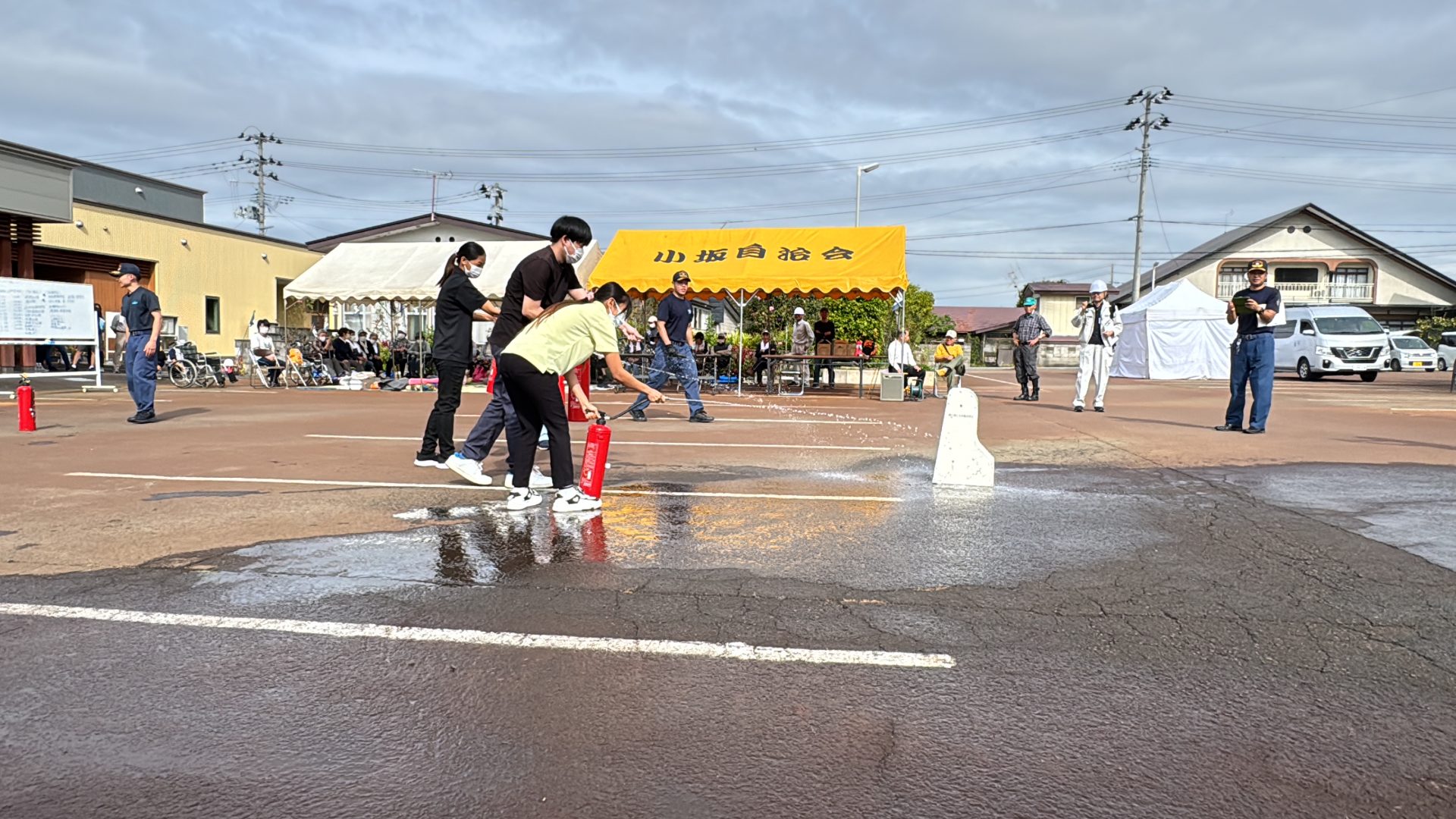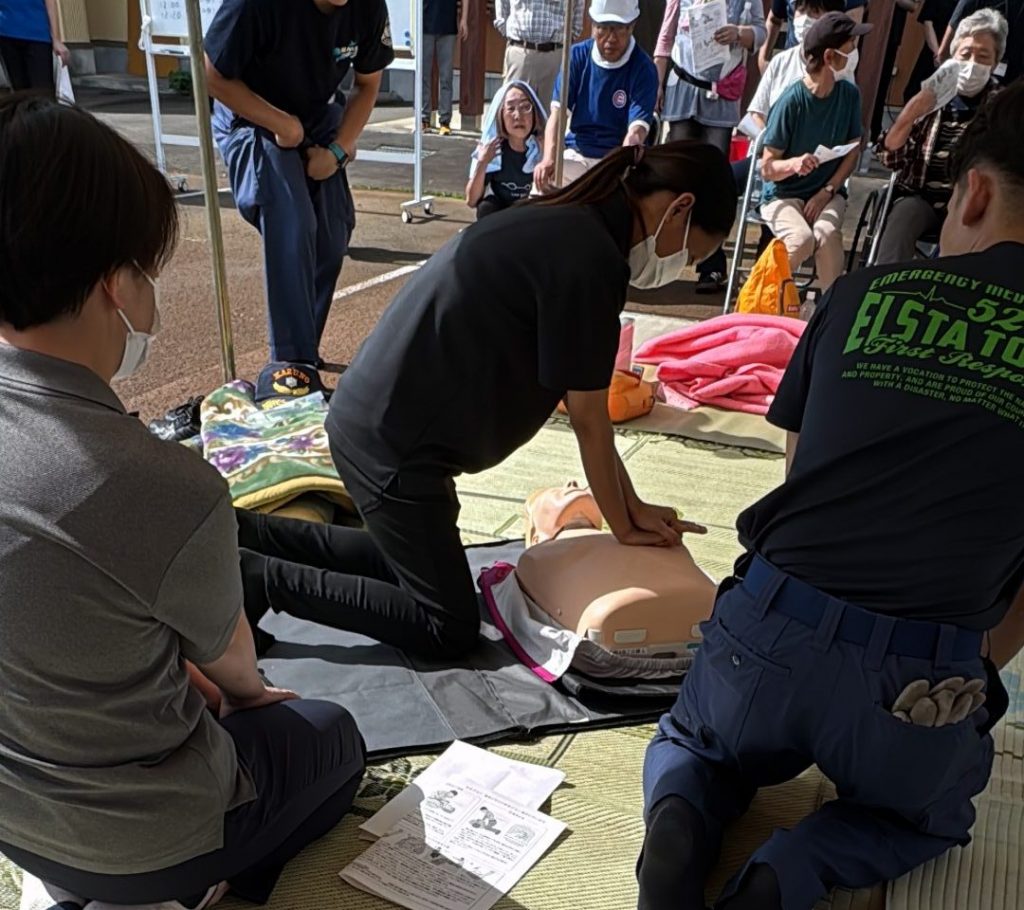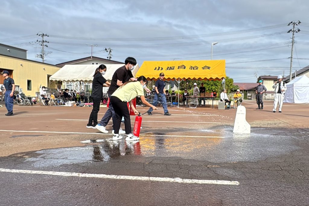 避難訓練の他にも屋外では地域の方々と一緒に煙体験や、心臓マッサージ、AEDの使用訓練、消化器を使った消火訓練、止血方法など鹿角消防署の消防士の方たちから様々なことを教えていただきました。