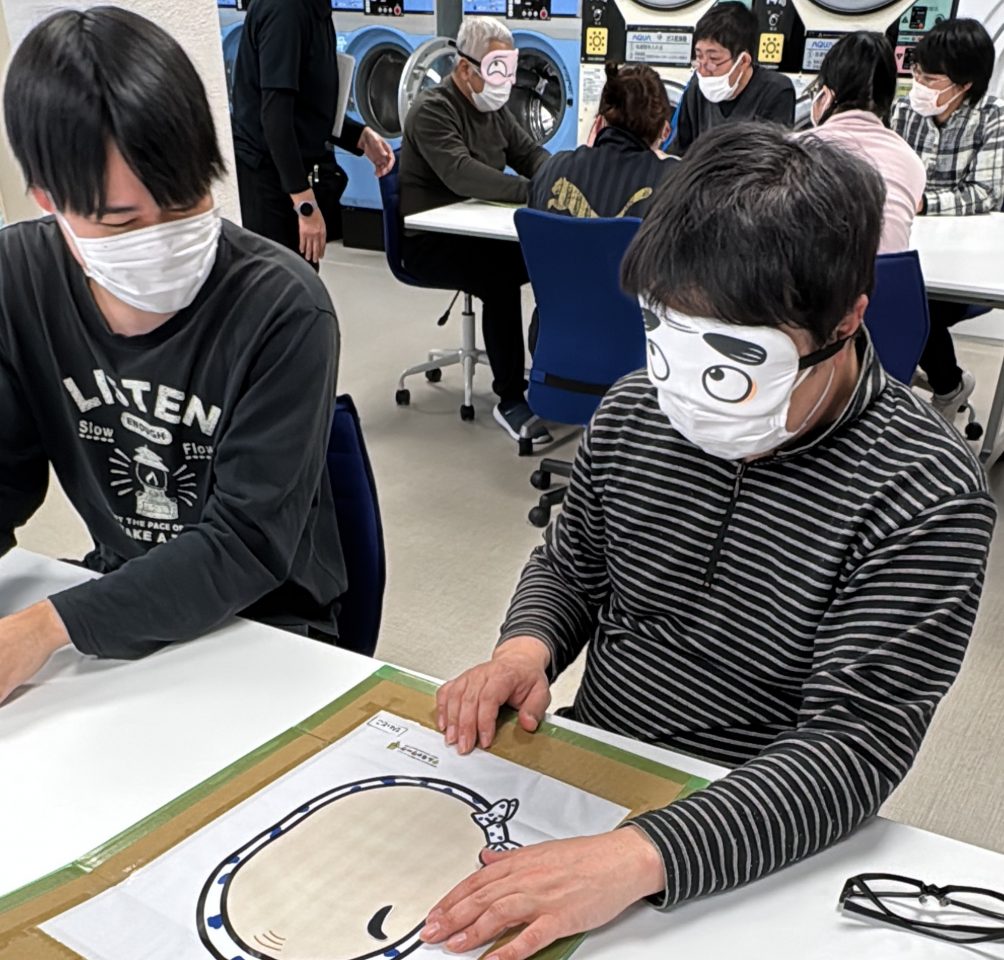 目隠しをした利用者さんを囲み、「もう少し右!」「目は、、、そこそこ!!」と周りの方が声をかけたり、応援をしながら、笑い声の絶えない時間となりました。