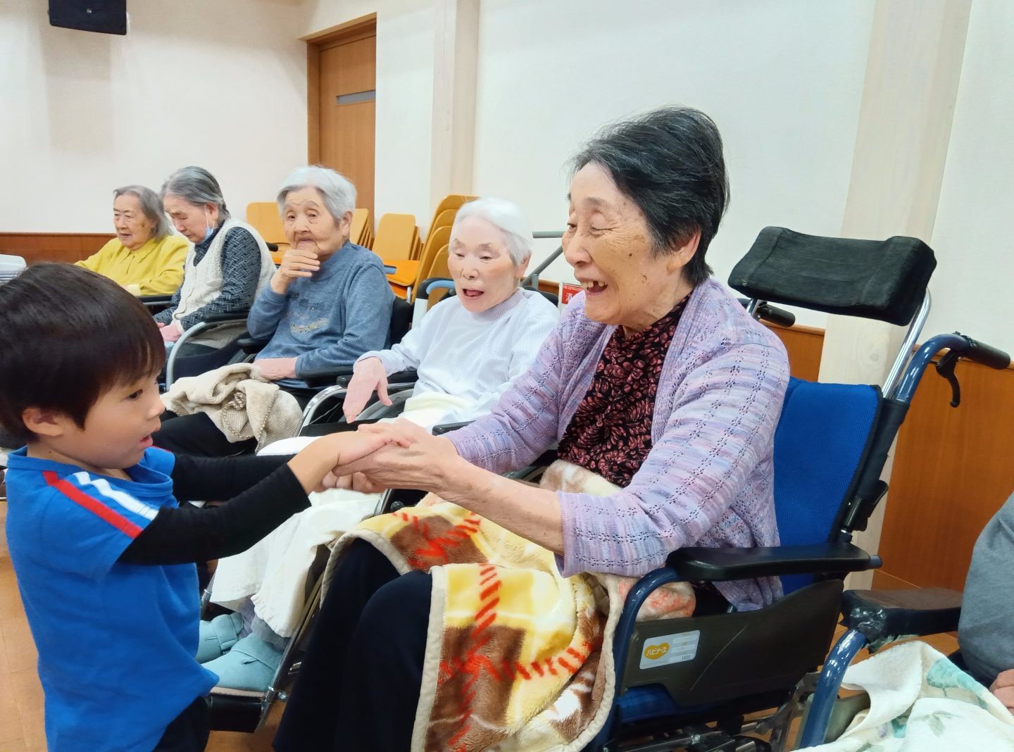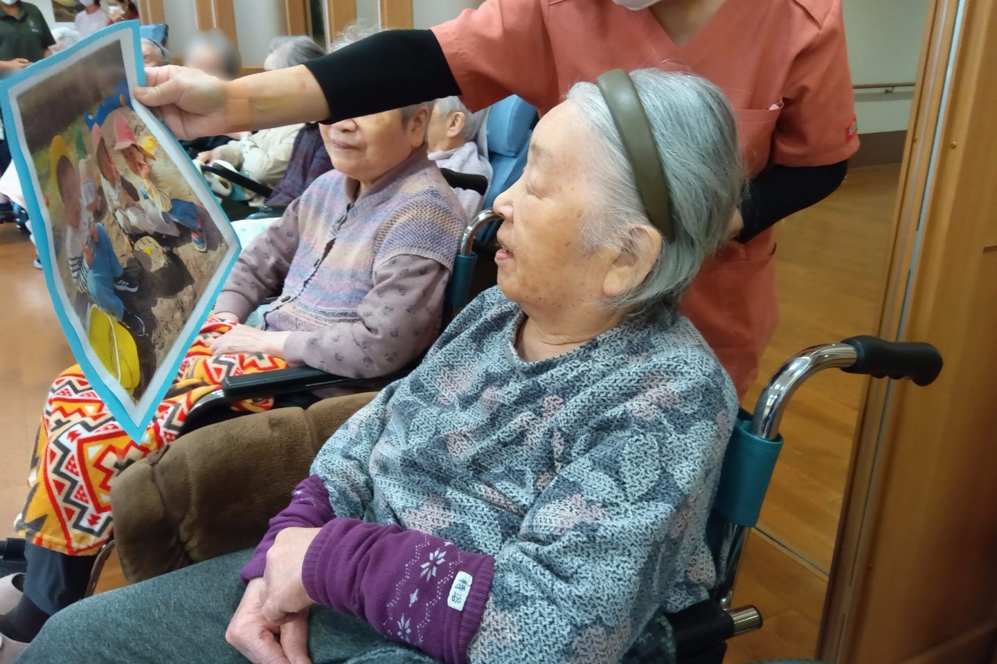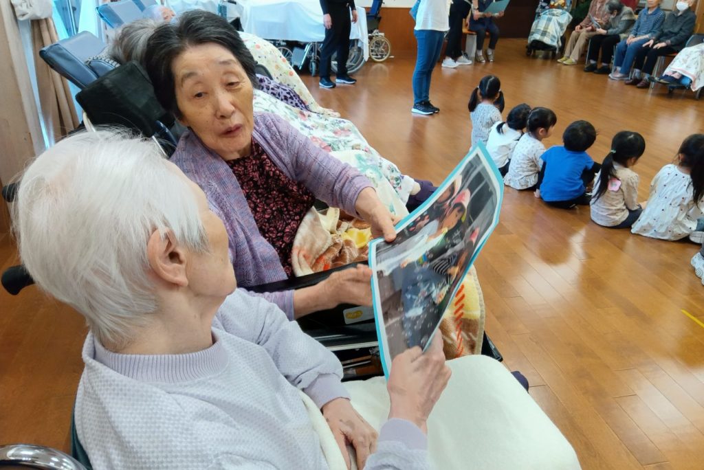 先生たちが保育園での様子を紙芝居のように紹介してくれて、これまた入居者さまの心をわしづかみ。「めんこいごど。」「あやあや、なもかもめんけ。」「すごいね。」とあちらこちらから話し声が聞こえてきていました。