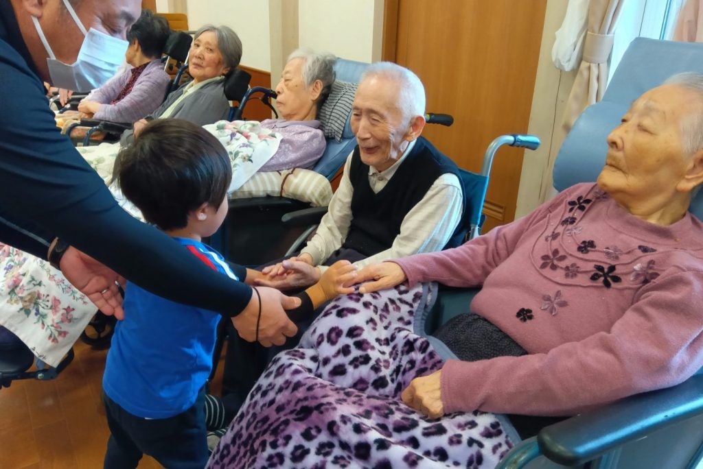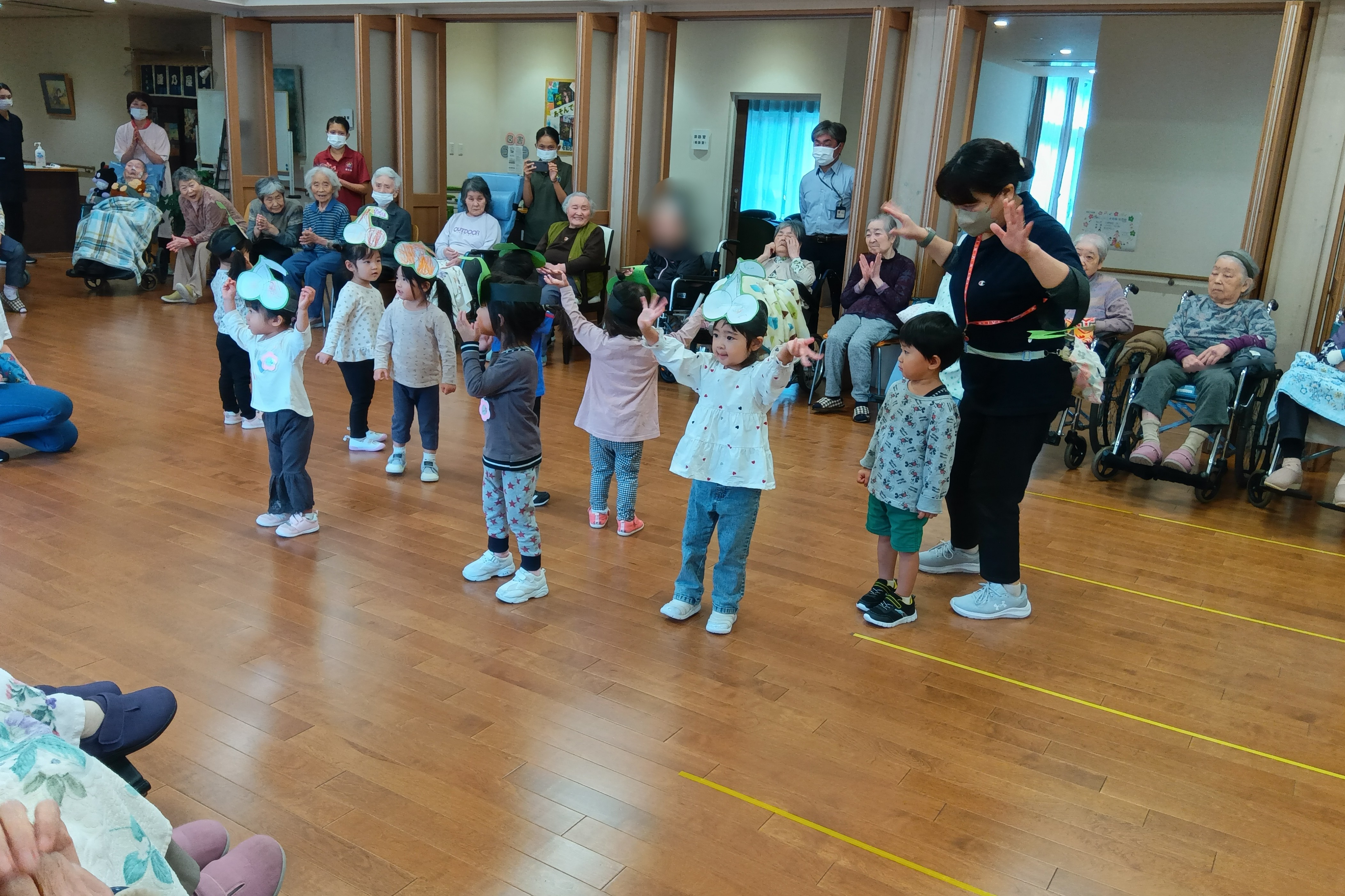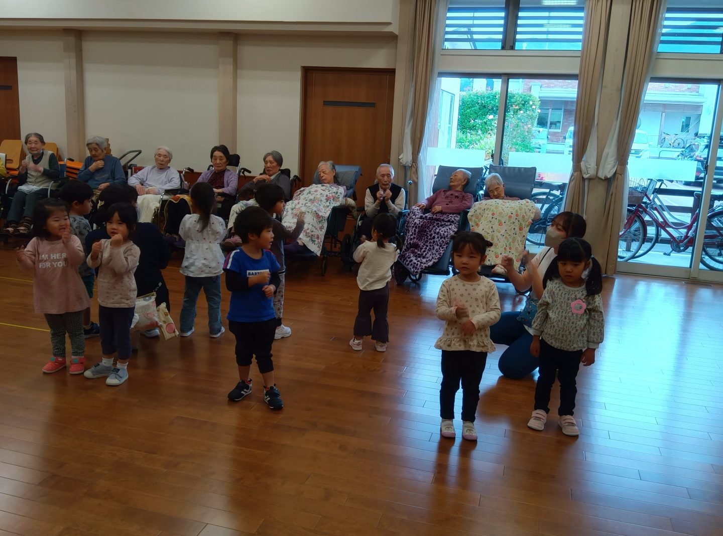 小さい子供たちが大好きな入居者さまは目を細めて拍手を送ったり、手遊びでは一緒に手を動かして楽しんでいる方もいました。