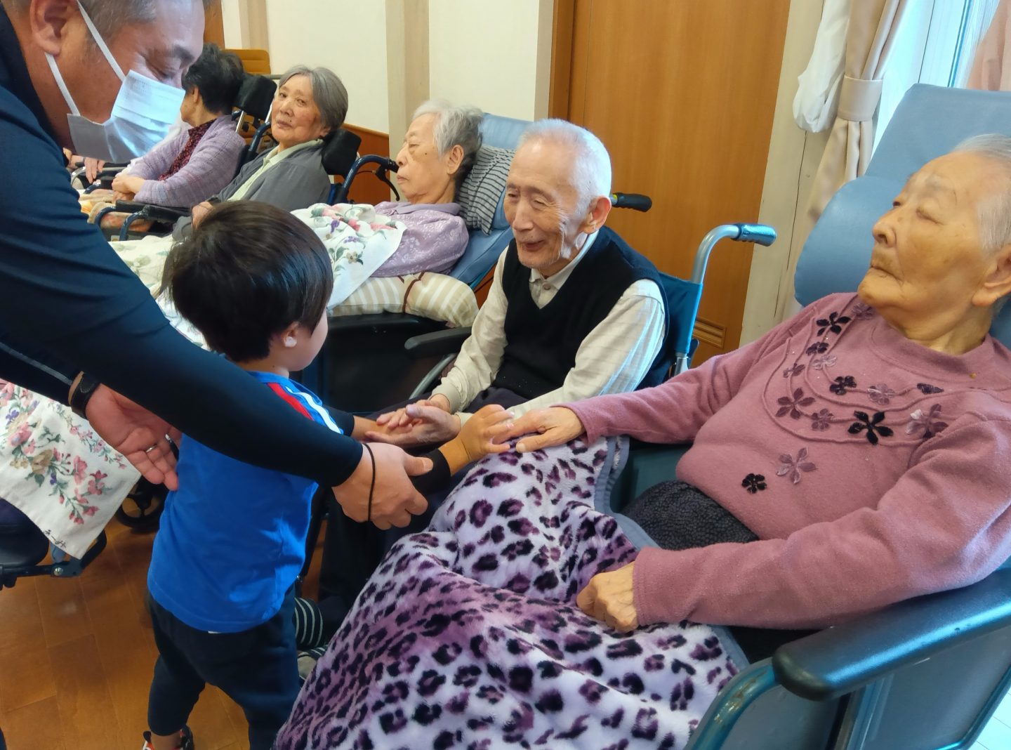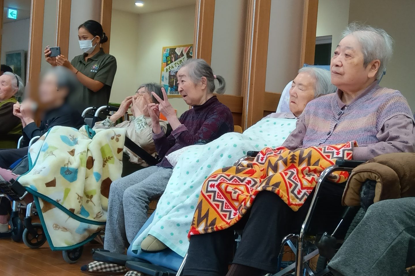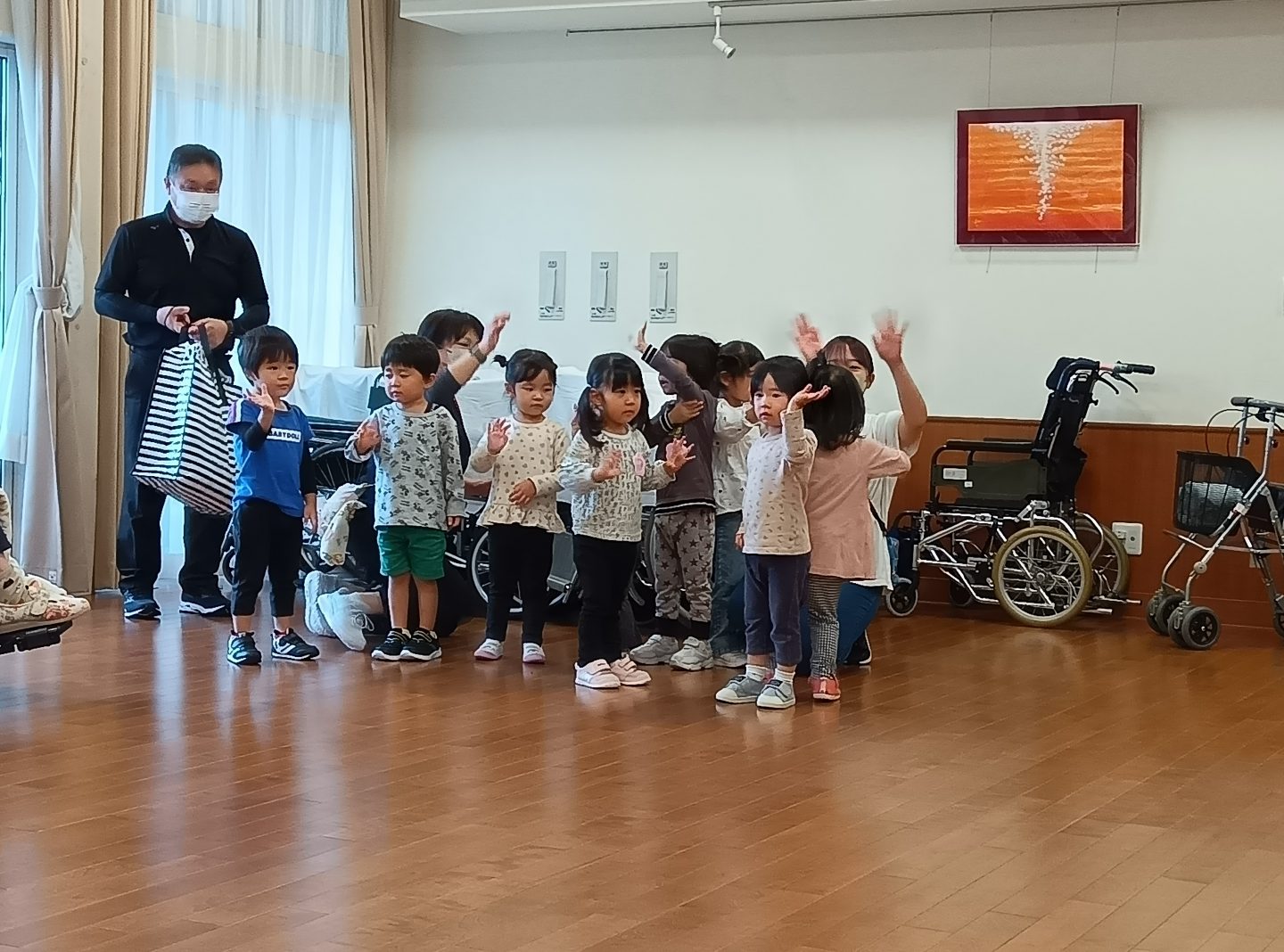 小さい子供たちが大好きな入居者さまは目を細めて拍手を送ったり、手遊びでは一緒に手を動かして楽しんでいる方もいました。