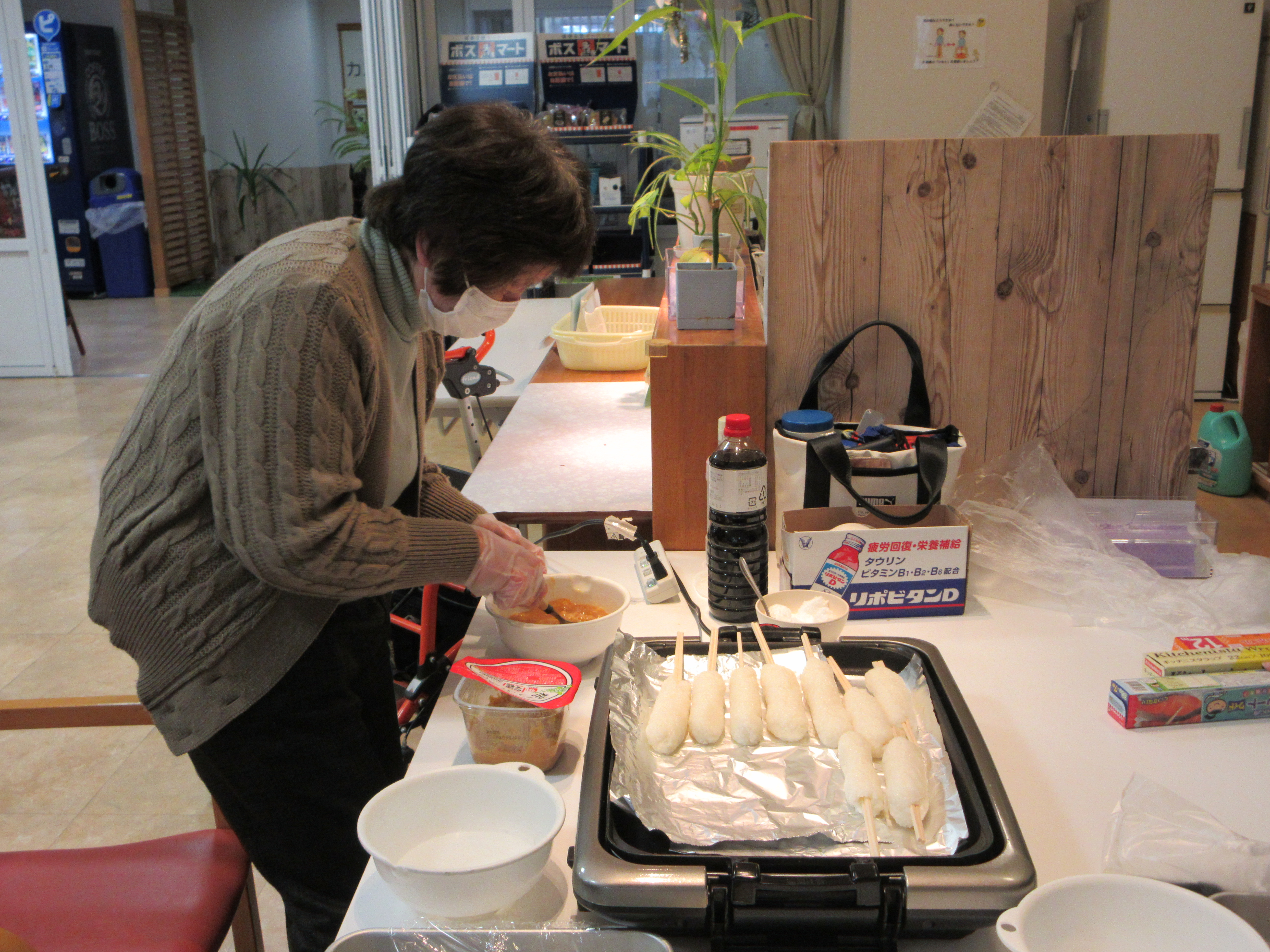 デイサービスセンターでは、秋田の郷土料理「みそつけたんぽ」を作る調理レクリエーションを実施しました。