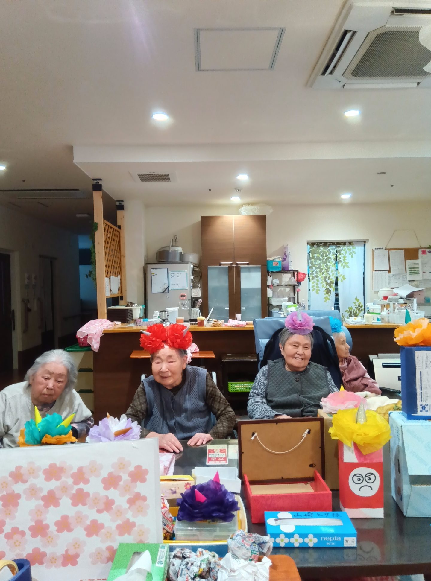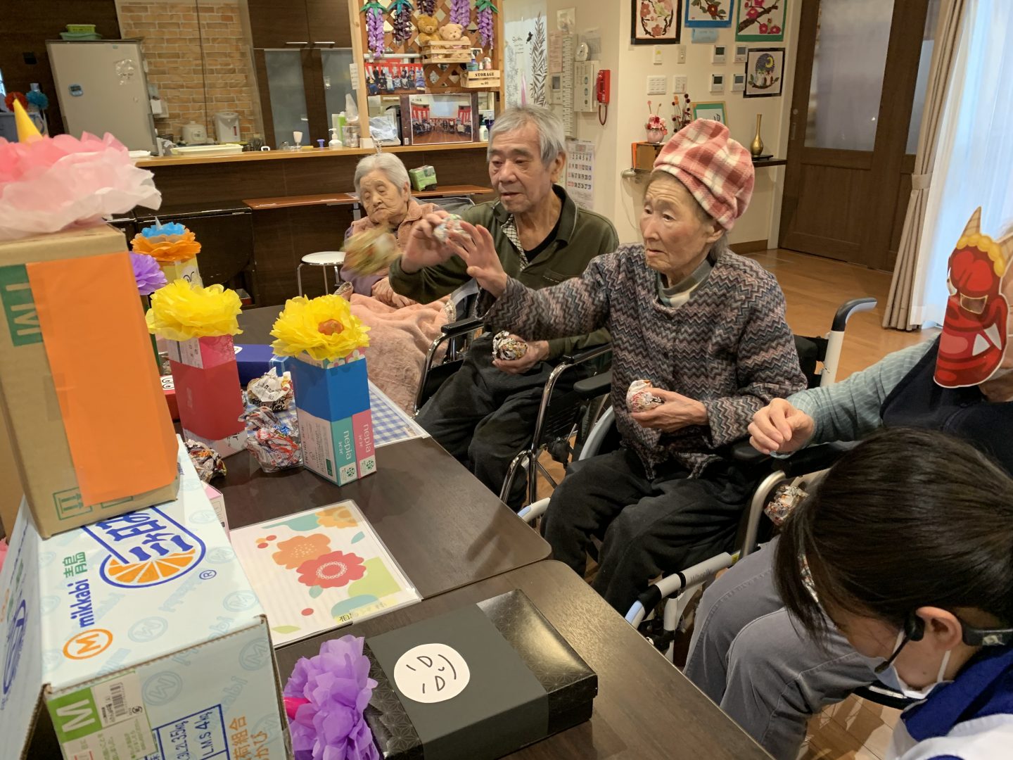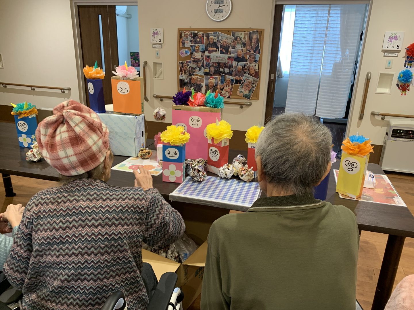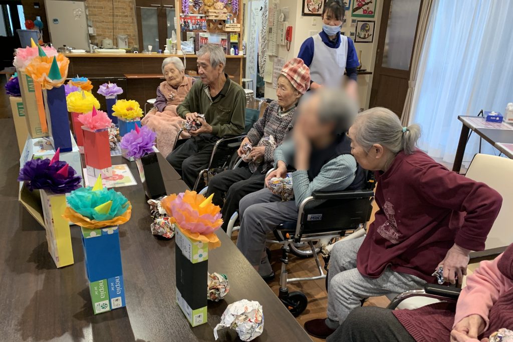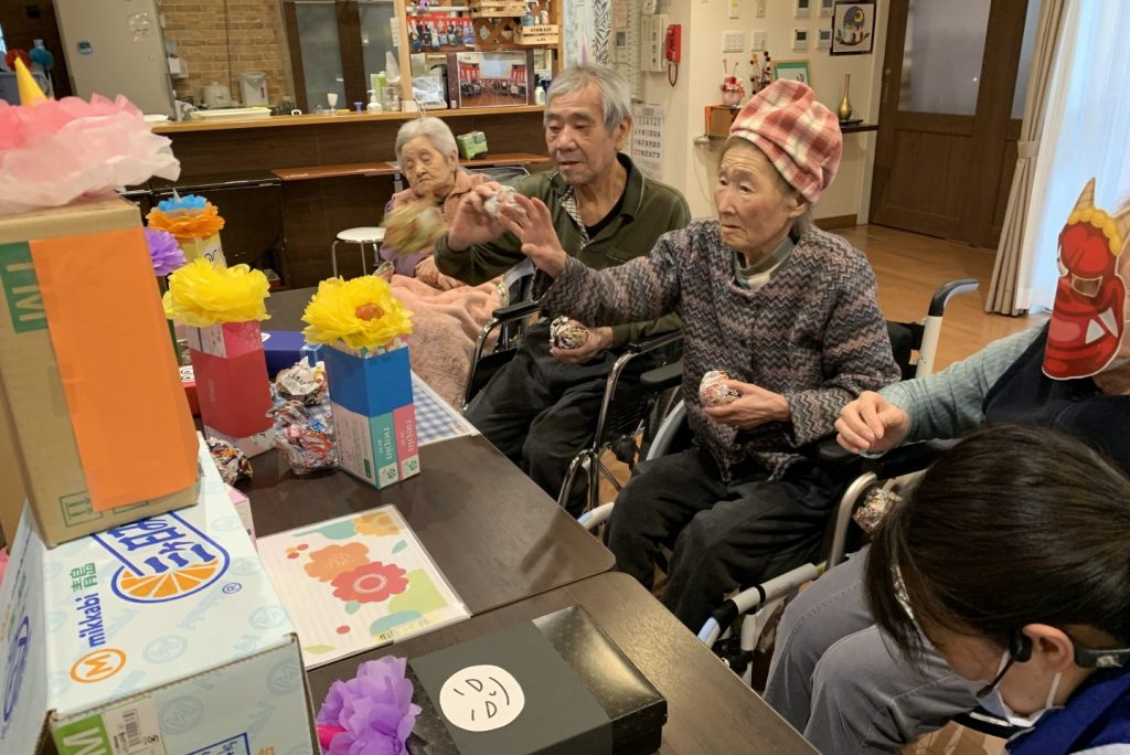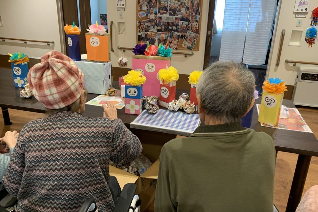 大小重さも違うさまざまな箱を鬼の顔を飾って的にして新聞ボールをぶつけて倒すこのレクリエーション。初めのうちは「ぶつければかわいそうだ。」「ごめんね。」と優しい言葉を投げかけてくれていた入居者さまたちでしたが、だんだんボールがぶつかっても倒れない鬼に白熱して倒すのに必死でした!